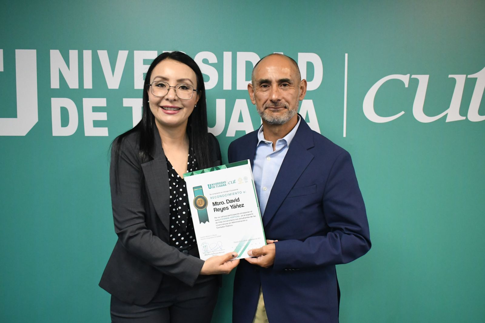 Finalmente, la Rectora del Sistema CUT, Universidad de Tijuana, maestra Yeni Marmolejo Mariscal, entregó un reconocimiento al maestro David Reyes Yáñez por compartir su conocimiento, experiencia y visión sobre el tema de la vivienda vertical, que sin duda despertó el interés y la reflexión de la comunidad universitaria.